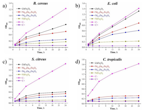 The magnetic NiZnFe nanocomposites were irradiated with ultraviolet light for 30 min and added to LB (for E. coli, B. cereus, and S. citreus) or Sabouraud (for C. tropicalis) broths to prepare a suspension (5 mL) with the concentration of 20 mg/mL. E. coli, B. cereus or S. citreus of 1.5 × 108 CFU/mL, or C. tropicalis of 1.5 × 106 CFU/mL (100 µL) were added into the suspension and incubated for 24 h at 28 °C or 37 °C, depending on the culture of the microorganism: B. cereus, S. citreus, and C. tropicalis or E. coli, respectively. Two hundred microliters of bacterial and yeast liquids were taken at 1 h, 6 h, 12 h, and 24 h, separately, to test the OD600 value. LB broth was used as a blank control, LB broth and inoculum as a negative control, LB broth, inoculum, and 100 ng/mg penicillin (for bacteria) or 2 µg/mL of fluconazole (for yeast) as a positive control.