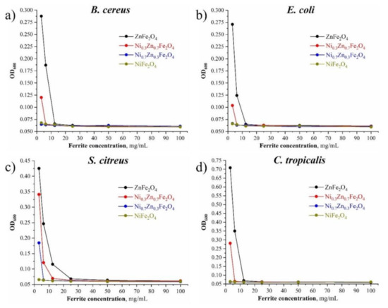 The synthesized Ni-ferrites have successfully demonstrated the ability to inhibit the growth of various microorganisms. The increase of Ni content contributed to the enhancement of antimicrobial activity. If comparing with Li-ferrites studied previously in [68], it should be noted that the studied samples showed a significantly higher result of antimicrobial activity against S. citreus. It was also found that Ni-ferrites inhibit the growth of yeast, all samples successfully suppressed the growth of C. tropicalis culture.