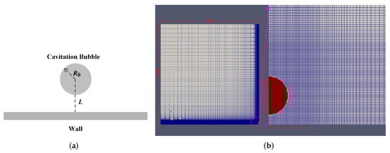 The simulations are assumed to be axisymmetric to reduce computational cost, the wedge geometry () with an opening angle set to be 5° is used in which is the bubble initial radius. The bubble center is initiated at a distance L above the rigid wall, as shown in Figure 1a. The mesh is generated with the local refinement using the OpenFOAM utility blockMesh, as shown in Figure 1b. The refinement region ranges from 0 to and from 0 to in x and z directions, respectively. In the local refinement zone, the grid spacing is uniform, and the total grid numbers depend on the cell numbers in the radial direction inside the bubble. Outside the refinement zone, however, the grid spacing increases with a progression factor of 1.05 until the boundary of the computational domain.