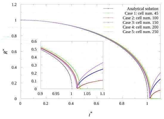 In addition, five different mesh resolutions, that is, 45, 100, 150, 200, 250 cells in the radial direction inside the bubble, are set to inspect the spatial resolution requirement in the numerical simulation. Figure 2 shows the numerical simulation results of the above five resolutions, compared with the analytical solution. It is found that for the five cases with different resolutions, the evolution of the bubble radius in the first and middle stages of the collapse is consistent with the analytical solution. In the final stage of the collapse, however, a significant time delay is observed between the numerical results and the analytical solution. The key reason is that the simplified Rayleigh–Plesset equation does not take the phase transition and heat transfer effect in the numerical model into account, which can exert a retardation effect on the collapse of the bubble. Besides, for grid independent studies, the time delay magnitude decreases with the cell numbers when the cell numbers in the radial direction inside the bubble ranges from 45 to 150, while the time delay magnitude basically does not vary with cell numbers when the cell numbers in the radial direction inside the bubble is larger than 150. Therefore, we select a case with 150 cells in the radial direction inside the bubble for further validation and simulation.
