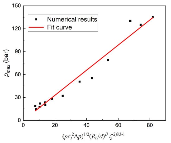 As can be seen from Formula (14), the acoustic energy is closely related to the pressure field, and thus the pressure field needs to be further verified to ensure the accuracy of acoustic energy. Supponen et al. [] established a model to measure shock wave peak pressures for bubbles deformed by gravity, a rigid and a free surface and obtained the relationship between peak pressures and various parameters, for example, , and so forth, as shown below:
