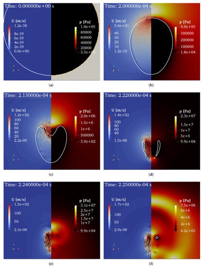 Figure 4 shows a time series of the collapse of the vapor bubble with . Initially, the ambient pressure is much higher than the pressure inside the vapor bubble, thus inertia forces are predominant, and the bubble starts to collapse (Figure 4a). The pressure gradient at the bottom of the bubble is less than that at the top of the bubble in the later stage of collapse due to the existence of the rigid wall, so that the bottom of the bubble collapses slower, leading to the formation of an oval-shaped bubble (Figure 4b). Meanwhile, a jet toward the rigid wall is generated at the top of the bubble. Subsequently, with the continuous impact of the jet on the bubble surface, the bubble gradually assumes a “heart-shape”. In addition, during the jet impingement process, the pressure gradient above the bubble top increases continuously, which leads to the further acceleration of the jet and aggravates the bubble collapse process (Figure 4c). In the final stage of collapse, the jet completely penetrates the lower surface of the bubble and continues to impact the rigid wall. At the same time, the bubble becomes a toroidal bubble and a high pressure region is generated below the bubble, indicating the first release of acoustic energy produced by the jet penetrating the bubble (Figure 4d). Finally, when the bubble reaches its minimum volume, the pressure difference between the inside and outside of the bubble reaches its maximum value, allowing a second stronger spherical shock wave to be emitted within a very short time (Figure 4e). Next in the rebound process of the bubble, the shock wave propagates radially outwards, hits the rigid wall and is reflected (Figure 4f).