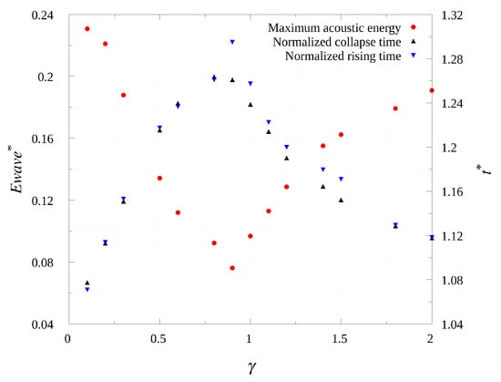 Diagram of the relationship between the maximum acoustic energy, normalized time of maximum acoustic energy, bubble collapse time and .