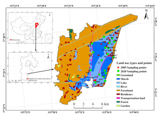 Location of Hengshui Lake wetland nature reserve, land use types, and sampling points.