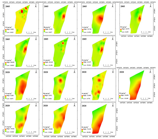 The temporal and spatial change characteristics of heavy metals concentrations are shown in Table 2 and Figure 2. In 2005, the average concentrations of Hg, As, and Cu exceeded the background value of Hebei province by 2.3, 1.4, and 1.2 times, respectively. In 2020, the average concentrations of Cd and Hg exceeded the background value of Hebei province by 1.9 and 1.4 times, respectively. The coefficient of variation (CV) reflects the dispersion of data and spatial changes in heavy metals [16,24]. In 2005, the CV of Zn reached 1.30, indicating that there might be significant spatial changes. Compared with 2005, the concentration of most heavy metals decreased in 2020, with the concentration of As decreasing the most (−54.3%), followed by Hg (−41.5%), Cu (−27.9%), Cr (−10.4%), and Pb (−2.4%). However, the concentration of Cd increased the most (860.0%), followed by Zn (1.4%) (Table 2).