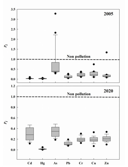 The single-factor pollution index (Pi) was used to show the pollution level of individual heavy metals. The results showed that, with the exception of As and Zn, the Pi of the other heavy metals in 2005 were all less than 1.0, indicating a non-pollution status except for As and Zn. In 2020, the Pi of all heavy metals were less than 1.0, indicating non-pollution (Figure 3).