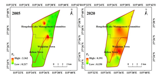 In 2020, the Pn indicated non-pollution for all sites. Areas with high Pn values were mainly distributed in the Jizhou Small Lake and near its causeway, as well as in the middle-northern portion of the Big Lake (Figure 2). These high values might have been related to the greatest number of industrial enterprises (such as medical equipment production and rubber industry facilities) in Weijiatun town, which has an industrial enterprises density of 6.5 individuals 100 ha−1 [26] and might have resulted in large quantities of wastewater containing heavy metals being discharged. Overall, the average Pn decreased from 0.56 in 2005 to 0.28 in 2020.