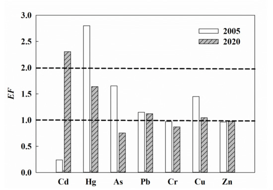 The enrichment factor (EF) can be used to evaluate the degree of heavy metals enrichment, as well as the influence of human activities on heavy metals and to identify probable sources [19]. In 2005, the EF values for Cd, Hg, As, Pb, Cr, Cu, and Zn were 0.1–0.8, 0.9–6.7, 0.6–7.3, 0.4–2.5, 0.5–1.6, 0.4–4.1, and 0.4–6.2, respectively. The maximum EF values of Zn and As were 16.0 and 11.5 times their minimal values. The average EF values for the seven investigated heavy metals were as follows: Hg (2.8) > As (1.7) > Cu (1.4) > Pb (1.1) > Cr (1.0) = Zn (1.0) > Cd (0.2). Hg was moderately enriched, while As, Cu, and Pb was lightly enriched and sediments were not enriched with Cr, Zn, and Cd (Figure 5). These results indicated that Cr, Zn, and Cd were not heavily influenced by human activities and were instead likely affected by soil elements, while Hg, As, Cu, and Pb were mainly influenced by human activities. Spatial evaluation revealed that high EF values for most heavy metals were mainly distributed in the Wangkou sluice and nearby the causeway (Figure S1), which were consistent with the high distributed of the concentrations (Figure 2) and the Nemero comprehensive pollution index (Figure 4).