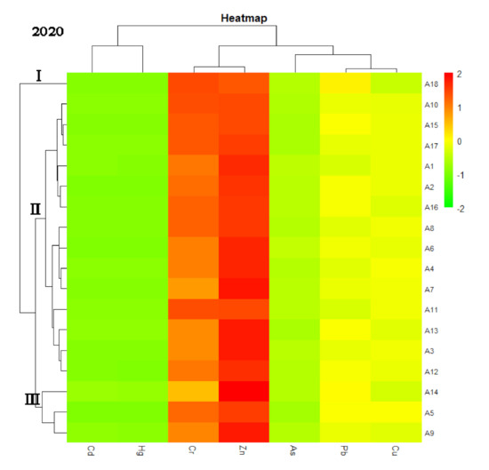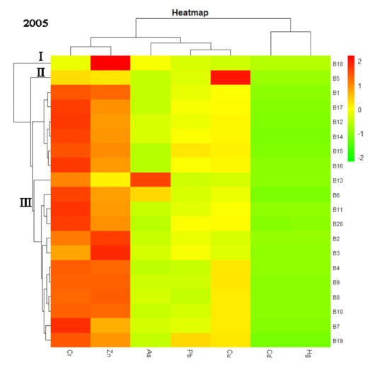 A heatmap with hierarchical cluster analysis is shown in Figure 6. The X-axis shows that the seven studied heavy metals were classed into two groups. Cd and Hg were in the same group, indicating that these two heavy metals were homologue. Cr, Zn, As, Pb, and Cu belonged to another group. The Y-axis shows that the studied points were divided into three groups. In 2005, group I merely had 1 point, accounting for 5.0% of the total points. Group II also had 1 point, accounting for 5.0% of the total points, which were lightly colored and indicated light pollution. Group III had 18 points, accounting for 90.0% of the total points, indicating the strong correlation of these points. In 2020, the group I merely had 1 point, accounting for 5.6% of total points, which indicated relatively light pollution; group II had 14 points, accounting for 77.8% of the total points; group III had 3 points, accounting for 16.7% of the total points, which indicated relatively heavy pollution, mainly located in the Jizhou Small Lake and near its causeway. This result was in consistent with the spatial distribution of high concentrations of heavy metals (Figure 2), high Nemero comprehensive pollution index (Figure 4), and high EF values for most heavy metals (Figure S1).