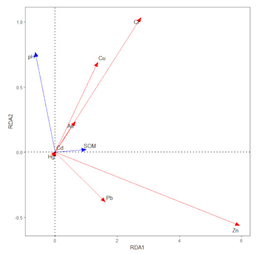 Biplot of RDA. The blue arrows represent the explanatory variables, and the red arrows represent the response variables. Explanatory variables: pH; SOM, organic matter. Response variables: Cd, Pb, Cr, Cu, Zn, Hg, and As.