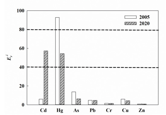 The potential ecological risk index (PRI) represents the sensitivity of the biological community to heavy metals and illustrates the risk posed by contamination [22]. The ecological risks posed by heavy metals are shown in Figure 8 and Figure 9. In 2005, the sequence of risk factor (Eir) was Hg > As > Cu > Cd > Pb > Cr > Zn. All of the studied heavy metals had low potential ecological risk, with the exception of Hg, which posed a considerable potential ecological risk. In 2020, the sequence of Eir was Cd > Hg > As > Pb > Cu > Cr > Zn. Cd and Hg showed moderate potential ecological risk, while the other studied heavy metals showed low potential ecological risk. Compared with 2005, the Eir for most of the heavy metals decreased in 2020, with that of As showing the greatest decrease (−54.3%), followed by Hg (−41.5%), Cu (−27.9%), Cr (−10.4%), and Pb (−2.4%); however, the Eir of Cd and Zn increased by 860.0% and 1.4%, respectively (Figure 8). These results were consistent with the results obtained for the temporal changes in the concentration (Table 2) and EF (Figure 5) and also indicated that the increase in Cd contamination warrants particular attention. In 2005, high Eir values of Hg, As, Pb, Cr, and Zn were mainly distributed in Wangkou sluice, while high Eir values of Cd and Cu were mainly distributed in the northern portion of the Big Lake. In 2020, high Eir values of Cd, As, Pb, Cr, Cu, and Zn were mainly distributed in the Jizhou Small Lake and near its causeway (Figure S2).