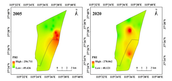 The average values of PRI in 2005 and 2020 were all below 150, indicating low ecological risk. However, the PRI of some points showed moderate ecological risk. These points were mainly distributed near Wangkou sluice and the northern portion of the Jizhou Small Lake in 2005, as well as in the Jizhou Small Lake and the middle regions of the Big Lake in 2020 (Figure 9). These high station distributions were largely consistent with the high station distributions of the concentrations (Figure 2), Nemero comprehensive pollution index (Figure 4), and enrichment factors (Figure S1). The spatial distribution of high concentration and correlation assessment indexes in the present study could be useful in identifying stations in Hengshui Lake that most need pollution control and treatment.