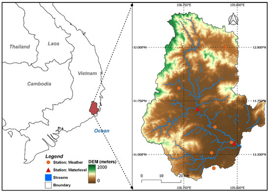 The Phan Rang River Basin of Nihn Thuan was selected as the study area (Figure 1). This area is characterized by a tropical monsoon climate affected by seasonal winds, and 80–90% of total annual rainfall is observed between September and December during the rainy season. In particular, the downstream part of the Pan Rang River Basin is a tidal river located in the low elevation areas, which is vulnerable to the sea level rise due to climate change, and natural disasters such as typhoons and floods frequently occur. For example, numerous typhoons and tropical cyclones caused serious flood damage of which the cost was over $9.5 million in 2017. One of the reasons of this damage is the lack of disaster management capabilities and insufficient prediction information [31,32,33,34]. Therefore, this study attempted to contribute to the strengthening of disaster management capabilities of this area by using water level prediction models such as DNN and LSTM models for the Phan Rang River Basin.