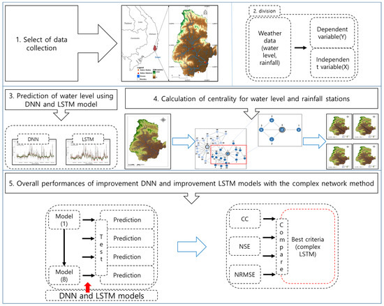 In this study, we tried to develop a model to supplement the above-mentioned problems and predict the water level. Figure 2 shows the flow chart of developing a water level prediction model. The calculation process to predict the water level, which is the purpose of the study, is as follows.