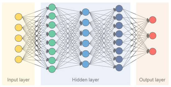 The DNN is an artificial neural network (ANN) with multiple layers between the input and output layers. There are different types of neural network model, but they always consist of the same components: neurons, synapses, weights, biases, and functions [35]. The structure of the DNN is similar to that of the ANN but has two or more numbers in the hidden layer (Figure 3). These components function similarly to the human brain and can be trained like any other machine learning algorithm. The DNN architectures generate compositional models where the object is expressed as a layered composition of primitives [35,36,42]. The extra layers enable the composition of features from lower layers, potentially modeling complex data with fewer units than a similarly performing shallow network. The core of deep learning is to find and predict patterns in a lot of data. Existing machine learning algorithms have limitations in performance as the amount of data increases, but deep learning has the advantage of linearly increasing performance as the amount of data increases.