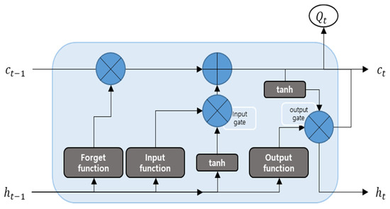 The LSTM model has three main gates, i.e., forget gate (), input data (), and output gate (). The forget gate () performs calculation on which information to discard and applies the of the previous step and of the current step to the sigmoid function to obtain a value between 0 and 1. This is multiplied by the current state, and in the process, the forget gate decides whether to use or discard the information and can be shown as: