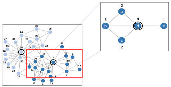 In this study, the importance of each weather station was evaluated using degree centrality among methods for centrality calculation such as degree centrality, closeness centrality, and betweenness centrality. Basically, the degree centrality method is a method for estimating the importance of each node by evaluating how to impact on other nodes connected to each other. In Figure 5, the degree centrality of node d had the highest importance as 4, and the degree centrality of node e had the lowest importance as 1. However, when performing a comparison with the degree centrality value for each node with other networks, it is difficult to make a fair comparison if the size of the network is different. Therefore, in this study, the importance was evaluated after normalizing degree centrality for each node by dividing it by , the maximum degree centrality value for each network, which can be shown as: