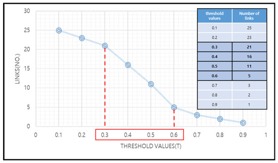 A complex network analysis was applied to the water level and rainfall stations located in the Phan Rang River Basin. Each station was represented as a node in the network. The correlation coefficient between stations was expressed as a link between nodes, and the strength of the link was calculated through the CC. Centrality was used to analyze the complex network. Looking at previous studies to calculate the degree of centrality, there is no specific method for setting appropriate threshold values, but threshold values from 0.1 to 0.9 are set at 0.1 intervals [36,40]. Therefore, in this study, the number of links was calculated according to the threshold at 0.1 intervals (Figure 8). Based on the set threshold values, four threshold values (T = 0.3, T = 0.4, T = 0.5, and T = 0.6) at which the graph changes rapidly were identified, and the four threshold values were used to construct the network.