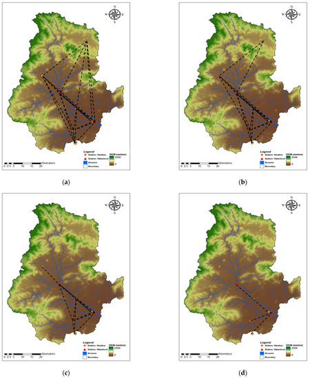 Construction of links in the stations network with four threshold values: (a) Threshold value = 0.3; (b) Threshold value = 0.4; (c) Threshold value = 0.5; and (d) Threshold value = 0.6.