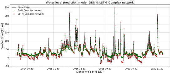 The complex network–LSTM model outperformed the DNN, LSTM, and complex network–DNN models for water level prediction. The complex network–LSTM model provided a high performance in predicting the daily water level variability and the peak values of the observed water level. The CC, NSE, and NRMSE values were 0.99, 0.99, and 0.17, respectively, for the complex network–LSTM model, and were 0.95, 0.89, and 4.41, respectively, for the complex network–DNN models. The evaluation metrics showed that all models were suitable for water level prediction, but the complex network–LSTM model was the best one.