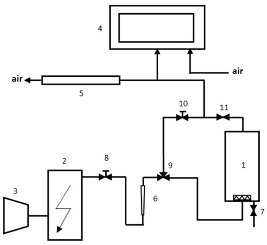 Ozonation gas distribution outline: 1—reactor; 2—O3 generator; 3—compressor; 4—O3 analyzer; 5—residual O3 thermo-catalytic destructor; 6—rotameter; 7—sampling port; 11—non-return valve; 8, 10—gate valves with manual actuators; 9—3-way valve.