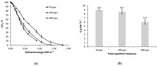 (a) Dexamethasone residual relative concentration dependent on delivered pulsed energy and (b) oxidation energy efficiencies at pulse repetition frequencies of 50, 200 and 880 pps: C0 = 10 mg L−1, initial pH 6.8, total treatment time was 30.0, 16.9 and 4.4 min for 50, 200 and 880 pps, respectively.