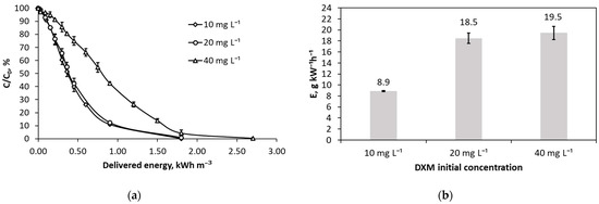 The initial concentration of the target pollutant determines the energy efficiency of oxidation as expected from the second-order reactions observed in PCD treatment of aqueous media [35]. The impact of variable DXM concentration was studied at initial concentrations of 10, 20 and 40 mg L−1. At the constant pulsed power released in the PCD reactor, the growing initial concentration exhibits a growing trend in oxidation efficiency (Figure 5), requiring, however, a higher energy dose and longer treatment time. Similarly, an increased DXM concentration resulted in better performance of, e.g., photocatalytic oxidation [25].