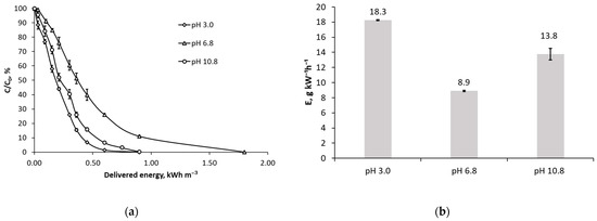 (a) Dexamethasone residual relative concentration dependent on delivered pulsed energy and (b) oxidation energy efficiencies at initial pH 3.0, 6.8 and 10.8: C0 = 10 mg L−1, pulse repetition frequency 50 pps, total treatment time 30 (pH 3.0 and 10.8) and 60 (pH 6.8) min.