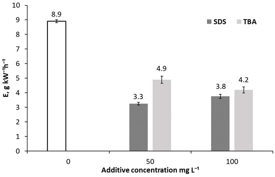 The energy efficiency of oxidation or energy yield E, g kW−1h−1, was calculated using Equation (5):