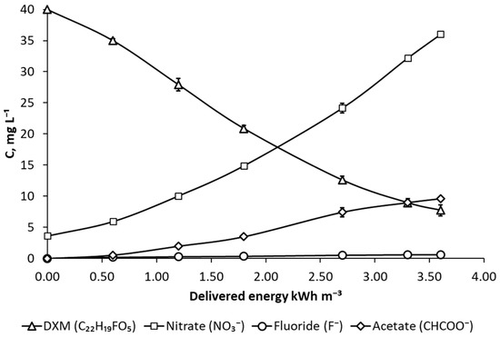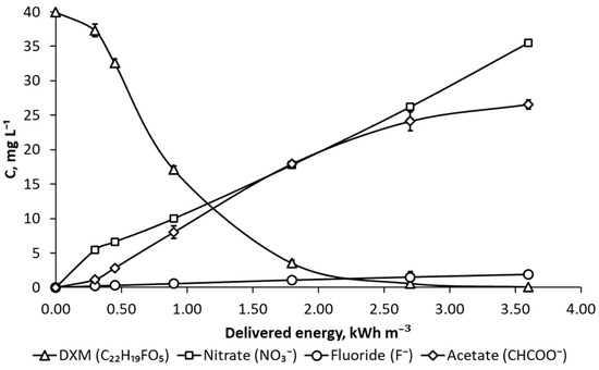 Ion chromatography analysis of the samples treated with PCD and ozone revealed fluoride and acetate being the main identified end-products of DXM oxidation (insets in Figure 8 and Figure 9). It is worth noting that the formation of fluoride in PCD is in stoichiometric ratio with DXM removal: 40 mg L−1 or 0.1 mM of DXM provides about 1.9 mg L−1 of fluoride, which approximately equals 0.1 mM content. However, acetate was formed in a quantity of 26.6 mg L−1 or 0.45 mM which is about 40% of the initial carbon content. Being refractory towards oxidation, acetate accumulated along with DXM removal. In PCD experiments, traces of oxalate and formate were also detected, although no accumulation of these products was observed (Figure 8).