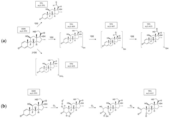 - Calza, P.; Pelizzetti, E.; Brussino, M.; Baiocchi, C. Ion Trap Tandem Mass Spectrometry Study of Dexamethasone Transformation Products on Light Activated TiO2 Surface. J. Am. Soc. Mass Spectrom. 2001, 12, 1286–1295. [Google Scholar] [CrossRef] [Green Version]