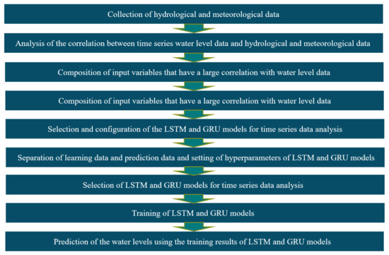 As shown in Figure 3, in this study, a flowchart for predicting time-series water levels by using LSTM and GRU models was presented. This study attempted to compare the accuracy of rapidly varying water-level prediction and the performance of models, using LSTM and GRU models. Data input and output to time-series models basically use water levels. However, since the water-level data alone have limitations in accurately predicting the rapidly changing water level, this study attempted to analyze the accuracy of the predicted water levels by using hydrological data (i.e., flow rate, temperature, vapor pressure, and precipitation) that are close to correlation with the water level as input data.