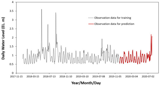 As shown in Figure 5, the selected daily average time-series water-level data were divided into data for learning and prediction of the models. In the case of rapidly changing hydrological time-series data, using previous research results [4], the best accuracy could be obtained if the optimal length of learning data and predictive data were selected as 74.9% and 25.1%, respectively, from the length of all time-series data. Therefore, as shown in Figure 5, data with black dotted lines were used as learning data for the models, and solid-red-line data were used as forecast data for the models and used to evaluate the accuracy of the models.