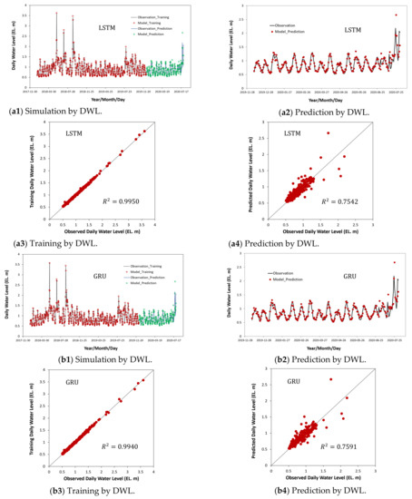 Observed and computed total time series water levels (a1) and (b1) as univariate input data, prediction (a2) and (b2) as univariate input data, for training (a3) and (b3), and for prediction (a4) and (b4): (a1–a4) Long Short-Term Memory (LSTM); and (b1–b4) Gated Recurrent Unit (GRU).