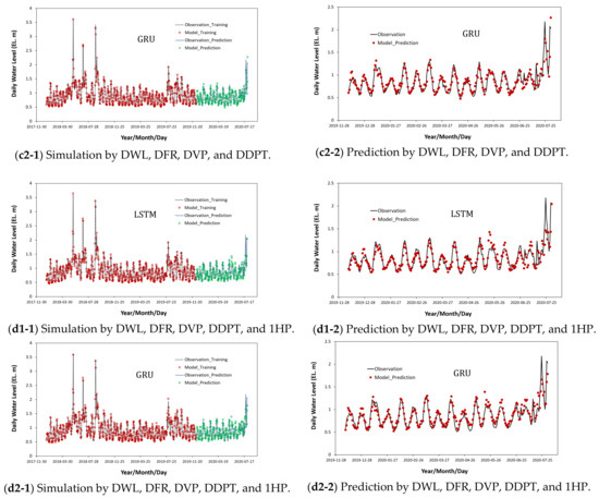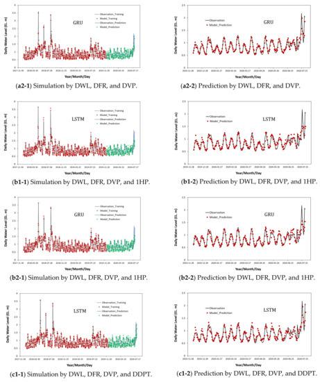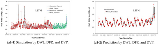 As shown in Figure 8(a1-1)–(a2-2), when trivariate training including DFR and DVP, which are data that are directly correlated with DWL, was performed, the prediction accuracy was high not only in the results of GRU () but also in those of LSTM (). In addition, similar to the bivariate training result, the trivariate training result was well matched with the observed data in the high-water-level-prediction result.