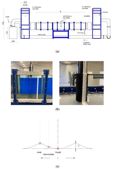 As already mentioned, the oscillating flow can be superimposed to or replaced by a steady current pushed by a pump connected to a recirculation system where a discharge varying between 0 and 0.25 m3/s can flow. More in detail, the recirculating equipment consists of a centrifugal pump with variable flow that can be manually adjusted by means of valve in a dedicated control panel, a filter section, and a flow measurement section; finally, an external pipe closes the circuit (Figure 1a).