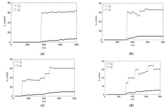 Ripple length and height evolution versus time. (a) Run M2 WO f = 0.2 Hz A = 0.154 m; (b) Run M4 WC f = 0.2 Hz A= 0.154 m uc = 0.14 m·s−1; (c) Run M3 WO f = 0.3 Hz A = 0.102 m; (d) Run M5 WC f = 0.3 Hz A = 0.102 m uc = 0.14 m·s−1.