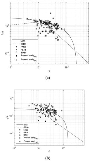 Comparison of ripple geometry data with ripple predictor models and other literature study (NI81 corresponds to [], GR04 to [], FA02 to [], PE18 to [] and BO81 to []): (a) non-dimensional ripple wavelength λ/A; (b) non-dimensional ripple height η/A.