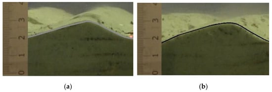 The dimensions of fixed ripples were chosen considering the results obtained on a movable bed; however, in order to carry out measurements at different positions along the ripple profile, larger wavelengths were reproduced in order to acquire more reliable velocity profiles. Therefore, the mean geometric characteristics obtained in the presence of a movable bed were increased by 50% to obtain the fixed bed dimensions, which, however, agreed with the dimensions predicted by Nielsen [] (see also Figure 3).