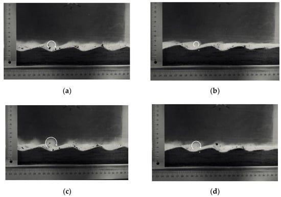 For Run M3 and Run M5, a complete wave cycle was extracted from the entire video and in turn divided into frames, starting from 5° up to 360° of the wave cycle with a step of 5°. Figure 5 shows the four most significant phases (90°, 120°, 190°, 250°) and, in particular, the evolution of vortices in the wave only case and collinear wave–current interaction case is reported on the left and right column, respectively.