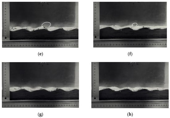 This representation agrees with the analyses suggested by Fredsøe et al. []. Comparing the results obtained in the present study to those of Fredsøe et al. [], it is noted that the vortices are identified in both cases. The maximum extension of the vortices in the present work occurs at the 120° phase, while according to Fredsøe et al. [], it occurs at the 150° phase with the identification of other small vortices during all the other phases. This difference is probably related to the shape of ripples; indeed, in the presence of waves and currents, where the ripples have a round crest, the vortices are less defined owing to the shape of the ripple itself [].