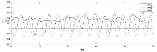 In Figure 6, the velocity time history for all three flow conditions (CO, WO, and WC) is shown. In particular, comparing the WC velocity with WO one, the first one turns out to be a modulated sinusoidal function that develops not entirely in the positive axis. This leads to time-averaged WC velocity being lower than the current only one, whose time history instead is almost constant and positive; therefore, locally and at some instants of the period, the dominant velocity in the WC case is the (negative) one of the waves, as a consequence of the wave dominated regime.