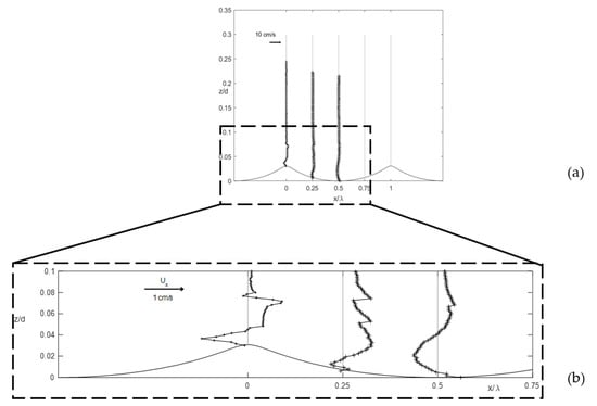 (a) Time-averaged velocity profile in the × direction Ux in the presence of wave only in three different acquisition points along ripple profile; (b) zoom of bed profiles.