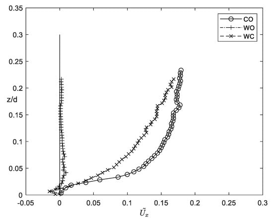 Mean velocity profile in condition of CO, WO, and WC (f = 0.3 Hz, A = 0.102 m, and uc = 0.14 m·s−1).
