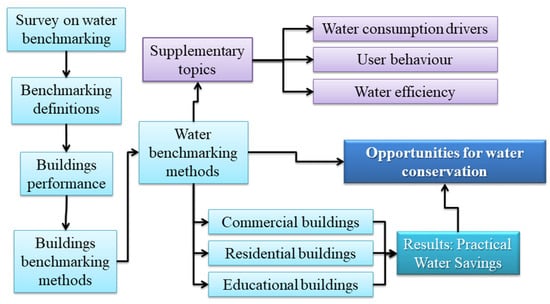 The review strategy considered firstly general benchmarking methods to find applicable systems to the water research field. This led to a review of several energy benchmarking systems, as they mainly appear when benchmarking in buildings is searched. Thus, to understand buildings performance was necessary to review several energy benchmarking methods. Then, water benchmarking systems became clearer, as studies suggested that it is possible to use energy benchmarking in water assessment in buildings. This understanding was aided through comprehensive supplementary topics, such as water consumption drivers, user behaviour, and water efficiency in buildings.