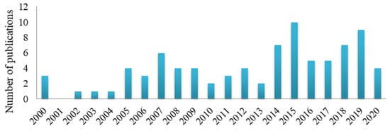 The year 2015 presented the most significant number of publications. However, the majority of papers concentrate on recent years. Although the number of publications on this topic is still limited, Figure 2 shows a growing number of published documents since 2000, especially from 2014 onwards. This topic is considered interesting even without a large number of publications, as it could establish novel methodologies and references to support water conservation in buildings.