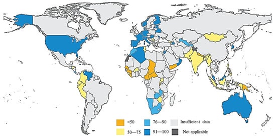 As for the educational buildings, the main challenge appears to be the lack of standardisation on indicators and information found. This could be linked to education standards around the world, which implicates students as well as the type of buildings where schools and universities are located. Nevertheless, in the same countries, such as Brazil, there are significant differences between such indicators and values, which generates concern about the quality of data available. The availability of data is another concern, as many countries on the globe present a lack of information on water use in educational buildings, as can be seen in Figure 4, which shows the proportion of schools with a basic drinking water service by country, 2016 (%).