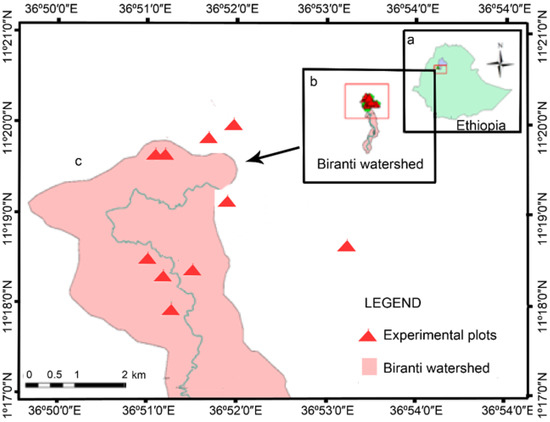 Location map of the study area. (a) Ethiopia, (b) Biranti watershed, and (c) Dengeshita experimental sites depicting the experimental plots.