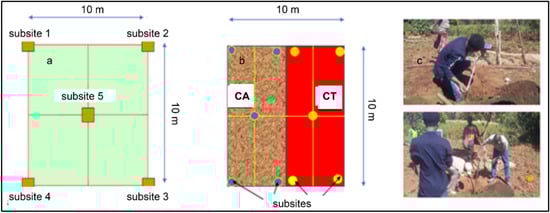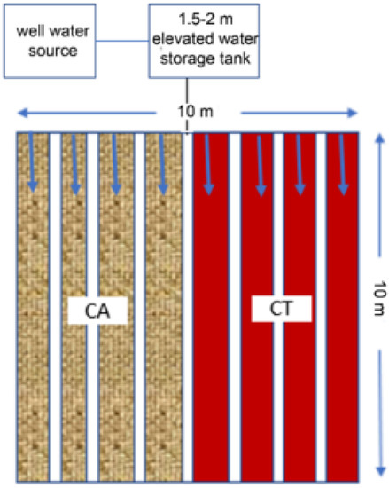 The CA and CT treatments were carried out on each of the ten plots. Half of the plot (50 m2) was randomly assigned to the CA treatment and half to the CT treatment (Figure 2). Vegetables were irrigated with a watering can for the first 1.5 years and drip irrigation for the remaining years.