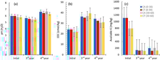 For both CA and CT, the increases in pH and CEC from the first to the fourth year were not significant (Figure 4a,b). With time, the decrease in available K was significant because K fertilizers were not used, and the initial concentrations were high (Figure 4c). Differences were not significant between CA and CT plots for pH, CEC, and available K for the two soil depths (Figure 4).